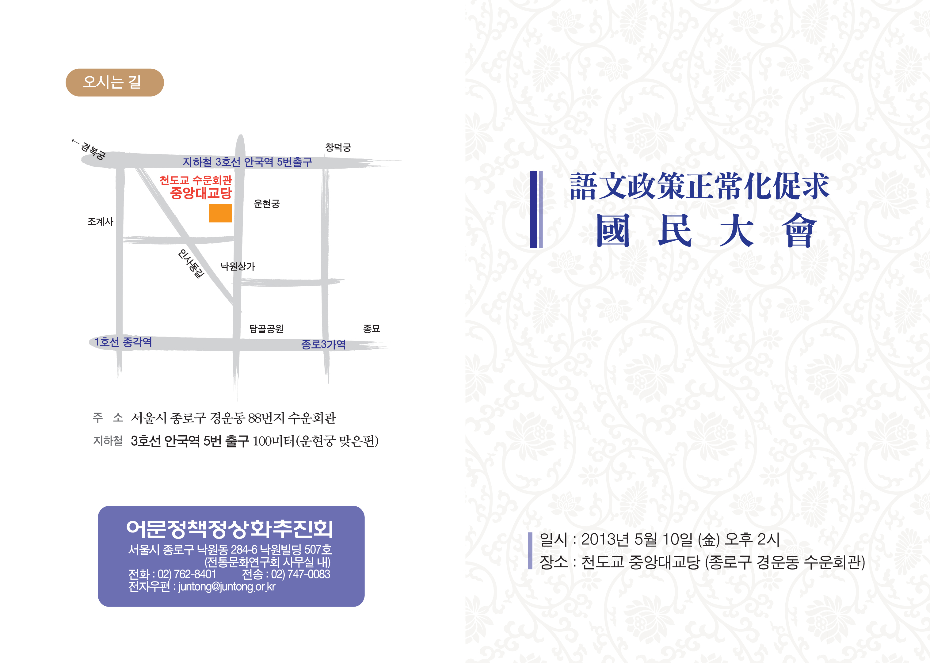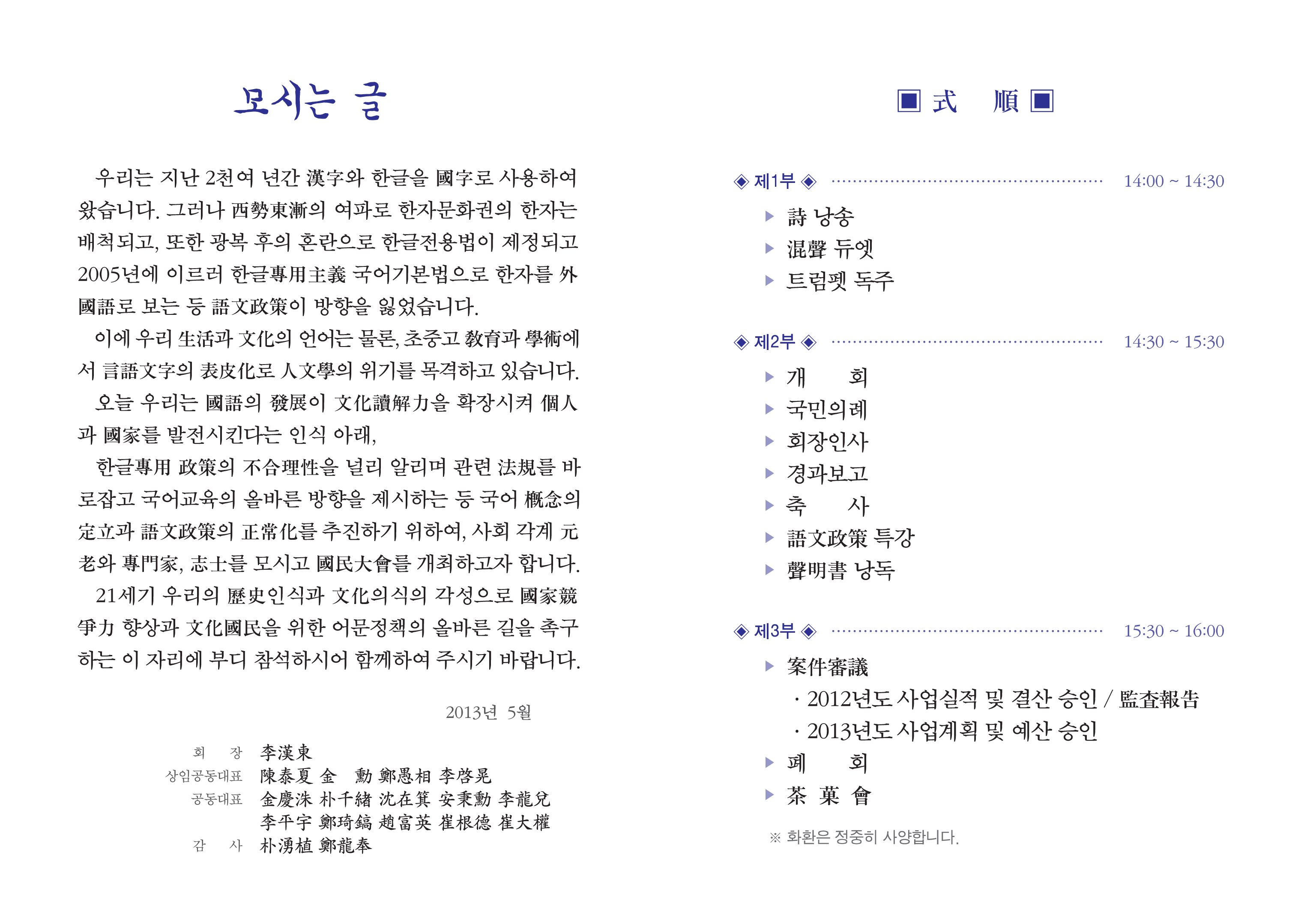 1. 語文政策正常化推進會(회장 李漢東, 前 국무총리)는 ‘어문정책 정상화를 위한 啓導’를 목적으로 오는 2013년 5월 10일(금) 오후 2시~4시까지 천도교 중앙대교당(종로구 경운동 수운회관)에서 어문정책정상화촉구 국민대회를 개최할 예정이다.